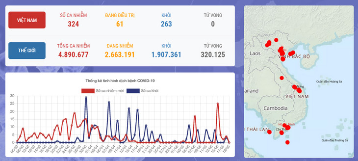 - Tính từ 6h ngày 16/4 đến 6h ngày 19/5: Đã 33 ngày Việt Nam bảo vệ đựơc thành quả bước đầu trong công cuộc chống dịch COVID-19 là không có ca lây nhiễm trong cộng đồng.