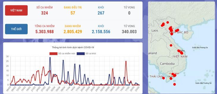 - Tính đến 6h ngày 23/5: Việt Nam có tổng cộng 184 ca nhiễm nhập cảnh được cách ly ngay. Tính đến sáng nay cũng bước vào ngày thứ 5, Việt Nam chưa ghi nhận ca bệnh nhập cảnh, kể từ 4 ca bệnh trờ về từ Nga và Mỹ được công bố chiều ngày 18/5