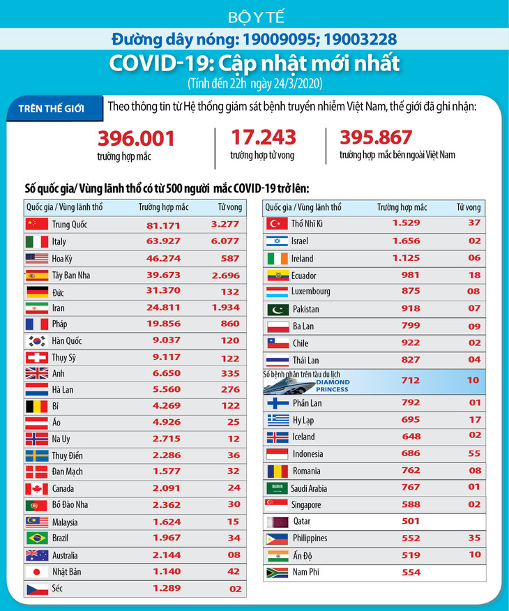 Thế giới: 396.001 người mắc, 17.243 người tử vong, trong đó: