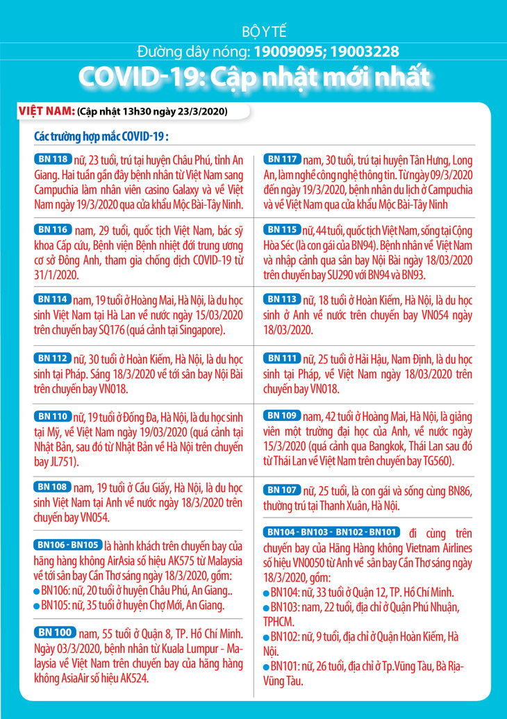 BN96: nữ, 21 tuổi ở Quận 8, TP. Hồ Chí Minh; từ Pháp về Việt Nam, quá cảnh Dubai trên chuyến bay của hãng hàng không Emirates số hiệu EK392 và nhập cảnh sân bay Tân Sơn Nhất ngày 19/3/2020.
