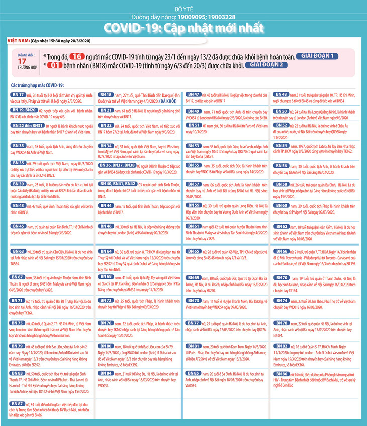 BN59: nữ giới, 30 tuổi, trú quán quận Long Biên, Hà Nội, là tiếp viên trên chuyến bay từ Vương Quốc Anh về Việt Nam ngày 02/3/2020.
