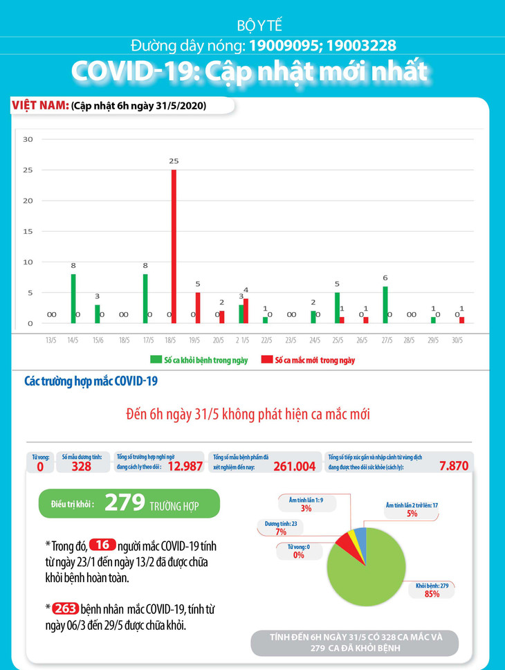 Bản tin lúc 6h ngày 31/5 của Ban Chỉ đạo Quốc gia Phòng chống dịch COVID-19 cho biết, đã 45 ngày Việt Nam không có ca mắc COVID-19 ở cộng đồng. Hiện sức khoẻ của bệnh nhân 328- bé trai 1 tuổi đang điều trị tại Bệnh viện Bệnh Nhiệt đới Hải Dương khỏe mạnh, ăn uống bình thường, không sốt, không ho...