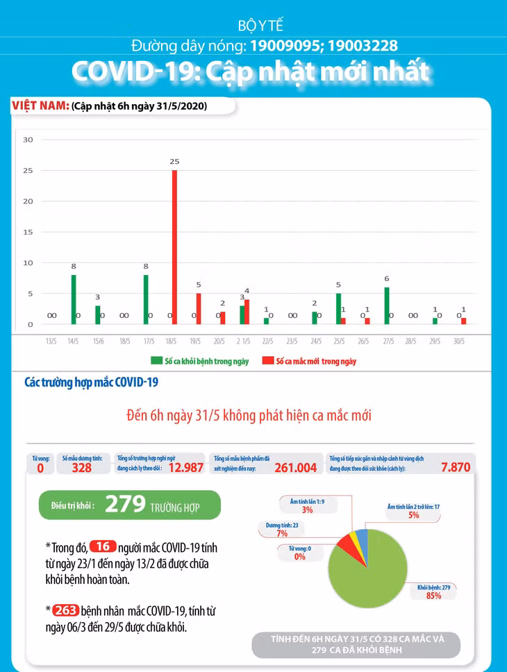 Tính từ 6h ngày 16/4 đến 6h ngày 31/5: Đã 45 ngày Việt Nam bảo vệ đựơc thành quả bước đầu trong công cuộc chống dịch COVID-19 là không có ca lây nhiễm trong cộng đồng.