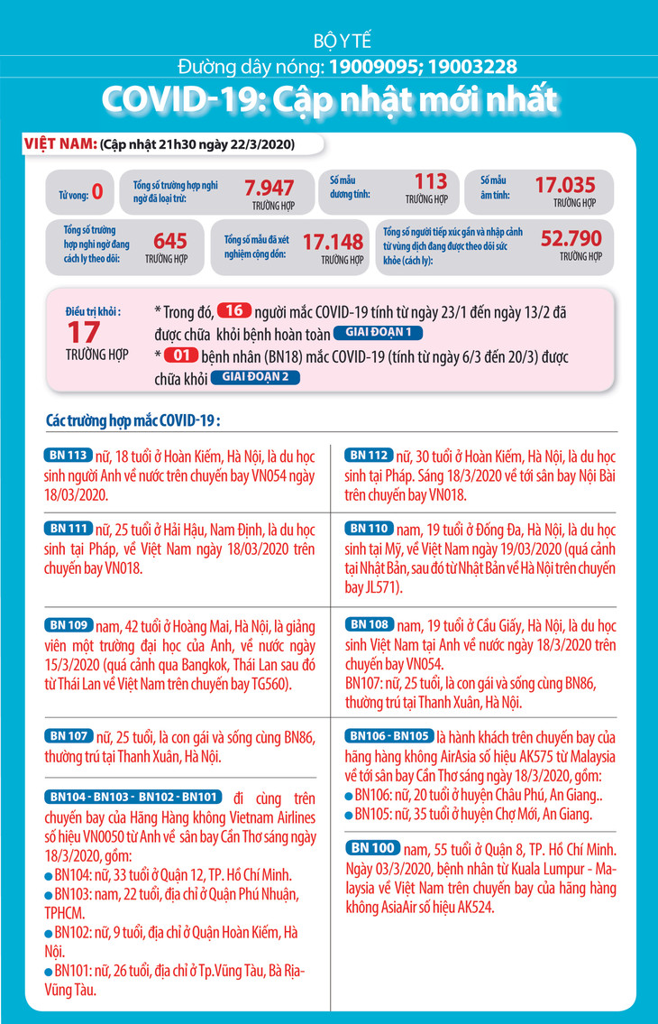 Việt Nam: 113 trường hợp mắc COVID-19. Trong đó: