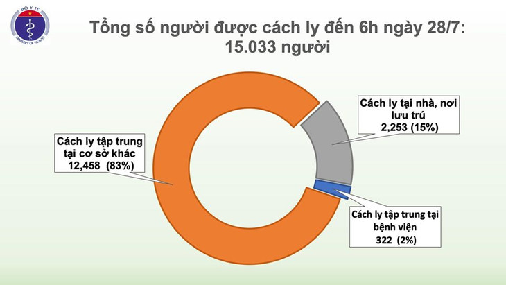 Tổng số người tiếp xúc gần và nhập cảnh từ vùng dịch đang được theo dõi sức khỏe (cách ly) là 15.033 người. Trong đó, cách ly tập trung tại bệnh viện là 322 người, cách ly tập trung tại cơ sở khác là 12.458 người, cách ly tại nhà, nơi lưu trú là 2.253 người.