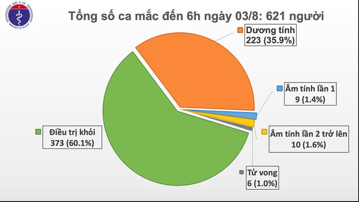 Tính đến 6h ngày 03/8, Việt nam, có tổng cộng 621 ca mắc COVID-19, trong đó 307 ca nhiễm nhập cảnh được cách ly ngay. Số lượng ca mắc mới liên quan tới Đà Nẵng tính từ ngày 25/7 đến nay ghi nhận 174 ca. Tính từ 18h ngày 02/8 đến 6h ngày 03/8, Việt Nam ghi nhận 1 ca mắc mới.