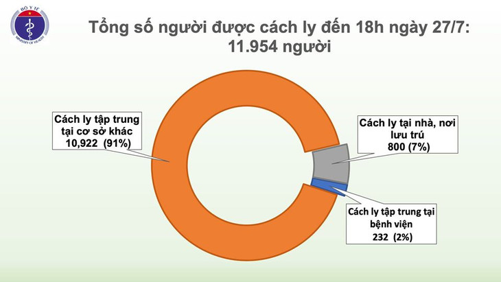 Tính đến18h ngày 27/7, Việt Nam có tổng cộng 431 ca mắc COVID-19, trong đó 276 ca nhiễm nhập cảnh được cách ly ngay. Tính từ 6h đến 18h ngày 27/7, Việt Nam có 11 ca mắc mới.