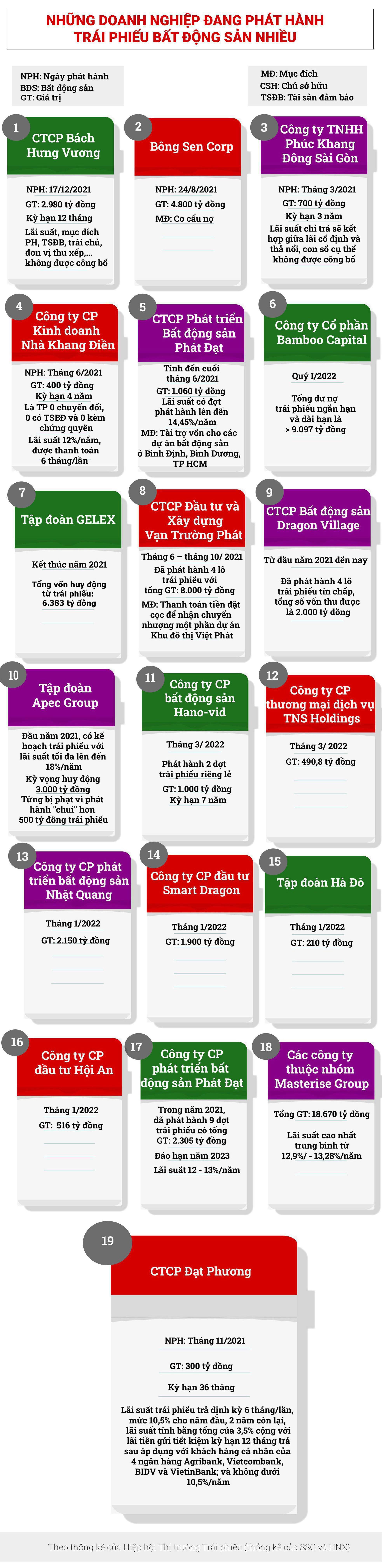 Theo thống kê của Hiệp hội Thị trường Trái phiếu (thống kê của SSC và HNX), rất nhiều doanh nghiệp bất động sản thời gian qua liên tiếp phát hành trái phiếu với lãi suất cao nhằm hút các nhà đầu tư.