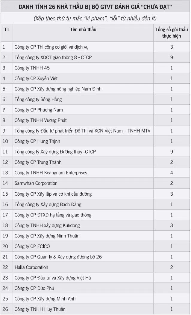 Điểm qua danh sách 26 nhà thầu bị Bộ GTVT “chuẩn y” là chưa đạt yêu cầu, có thể thấy những nhà thầu nước ngoài thân quen với thị trường xây dựng Việt Nam như: Công ty TNHH Keangnam Enterprises, Samwhan Corporation, Công ty TNHH xây dựng Kukdong. Về phía nhà thầu trong nước cũng có những nhà thầu tên tuổi bị “dính chàm” như: Tổng công ty Xây dựng đường thủy – CTCP (Vinawaco); Tổng công ty Xây dựng công trình giao thông 8 – CTCP (Cienco8); Tổng công ty Xây dựng Sông Hồng; Tổng công ty Xây dựng Bạch Đằng; Tổng công ty Đầu tư phát triển Đô thị và Khu công nghiệp Việt Nam – TNHH MTV; Công ty cổ phần Xây lắp và cơ khí cầu đường; Công ty CP ĐTXD hạ tầng và giao thông… Trong bảng danh sách 26 nhà thầu trên, có 2 nhà thầu tham gia nhiều gói thầu nhất (thực hiện 9 gói thầu) của Bộ GTVT là Cienco8 và Vinawaco, còn đa số nhà thầu “dính chàm” chỉ tham gia thực hiện 1 gói thầu của Bộ GTVT.