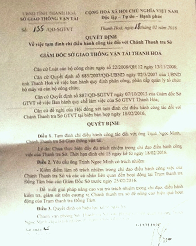 Theo đó, ngày 18/2, Giám đốc Sở GTVT Thanh Hóa Mai Xuân Liêm đã ký Quyết định số 135/QĐ-SGTVT về việc tạm đình chỉ điều hành công tác đối với ông Trịnh Ngọc Minh, Chánh thanh tra Sở GTVT Thanh Hóa.