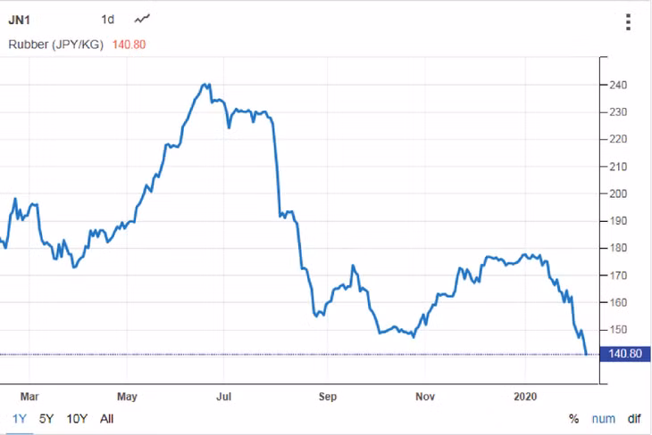 Tiếp đà tăng của những tháng cuối năm 2019, giá cao su có xu hướng tăng trong 20 ngày đầu tháng 1/2020. Tuy nhiên, giá cao su đã quay đầu giảm mạnh trong thời gian gần đây. Cụ thể, tại Sở Giao dịch hàng hóa Tokyo (TOCOM), ngày 31/1, giá cao su giao kỳ hạn tháng 3/2020 được giao dịch ở mức 1,59 USD/kg, giảm 7,3% so với cuối tháng 12/2019. Tại Thượng Hải, giá cao su giao kỳ hạn tháng 3/2020 ngày 31/1 giao dịch ở mức 1,74 USD/kg, giảm gần 7% so với cuối tháng 12/2019.