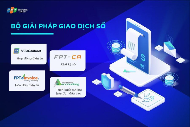 Theo đó, FPT đã đưa ra Bộ giao dịch số gồm Hóa đơn điện tử (FPT.eInvoice), Hợp đồng điện tử (FPT.eContract), Trích xuất dữ liệu và Quản lý hóa đơn đầu vào (FPT Digital Accounting) và Chữ ký số (FPT.CA). Bộ giao dịch số này là một trong những giải pháp công nghệ chiến lược nằm trong hệ sinh thái công nghệ Made by FPT, đáp ứng nhu cầu chuyển đổi số các quy trình hoạt động, tăng hiệu suất trong vận hành, mang đến những trải nghiệm khách hàng mới mẻ, đảm bảo kinh doanh không gián đoạn để có thể vượt qua thách thức của các doanh nghiệp trong bối cảnh hiện nay.