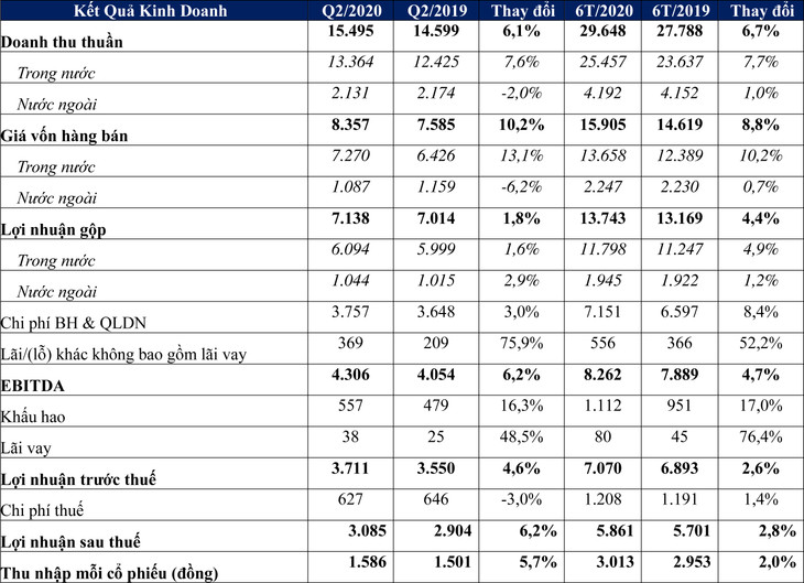 Trong Quý 2/2020, doanh thu thuần hợp nhất của Vinamilk đạt 15.495 tỷ đồng, tăng 9,5% so với quý 1/2020 và tăng 6,1% so với cùng kỳ 2019.