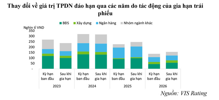 Thương lượng gia hạn trái phiếu góp phần làm thay đổi sức ép từ việc đáo hạn trái phiếu mà các doanh nghiệp phải đối diện trong thời gian còn lại của năm 2023 và trong 2 năm tới. Đa số các trái phiếu đã được thương lượng gia hạn với kỳ hạn 2 năm, điểm này đã làm thay đổi đáng kể cấu trúc về giá trị trái phiếu doanh nghiệp đáo hạn trong giai đoạn 2023-2026 tại thời điểm tháng 10/2023 so với thời điểm trước khi Nghị định 08 được Chính phủ ban hành. Theo số liệu của VIS Rating, có thể thấy rõ giá trị trái phiếu đáo hạn giảm trong các năm 2023-2024 và tăng trong năm 2025-2026. Điều này cũng phù hợp với nhận định, giá trị trái phiếu đối diện rủi ro mất khả năng trả gốc/lãi đã đạt đỉnh trong quý I/2023 và dự kiến giảm dần trong năm 2024.