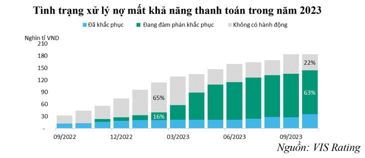 Trong các lựa chọn xử lý áp dụng với trái phiếu doanh nghiệp khi tổ chức phát hành không đáp ứng được nghĩa vụ nợ, gia hạn thời gian đáo hạn trái phiếu là phương án được lựa chọn nhiều nhất, lên tới 81% tổng số trái phiếu đã được thương lượng giải quyết. Các lựa chọn khác như thanh toán nhiều lần, thanh toán bằng tài sản và thanh lý tài sản bảo đảm chỉ được thực hiện tương ứng với 15%, 2% và 2% tổng số trái phiếu đã xử lý thông qua thương lượng. Tổng giá trị trái phiếu đã được gia hạn lên tới 36 nghìn tỷ đồng tại thời điểm cuối tháng 9/2023. Việc gia hạn trái phiếu được lựa chọn do 2 lý do. Thứ nhất là sự đơn giản trong việc thực hiện dựa trên sự đồng thuận của tổ chức phát hành và trái chủ, không cần tới sự tham gia của các tổ chức độc lập khác. Thứ hai, việc áp dụng phương pháp gia hạn trái phiếu trong đại đa số trường hợp không làm phát sinh thêm chi phí đối với tổ chức phát hành. Theo số liệu của VIS Rating, có 87% số trái phiếu gia hạn thành công trong giai đoạn 6 tháng kể từ tháng 3/2023 không phải chịu thay đổi lãi suất cuống phiếu.