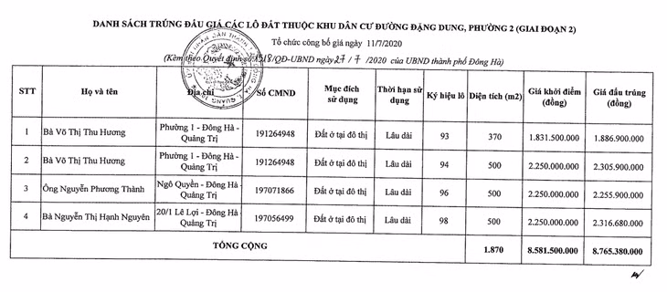 4 lô đất có tổng diện tích 1.870m2 thuộc Khu dân cư đường Đặng Dung vừa được bán đấu giá thành công. 4 lô đất được quy hoạch mục đích là đất ở đô thị, nhà nước giao đất có thu tiền sử dụng đất. Tổng số tiền trúng đấu giá là 8,765 tỷ đồng.