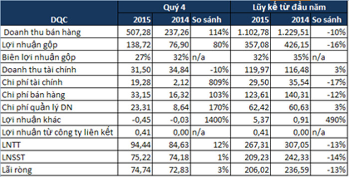 Lợi nhuận sau thuế quý 4/2015 đạt 75,22 tỷ đồng, tăng 1%, cả năm đạt 209,23 tỷ đồng giảm 14% cùng kỳ năm trước.