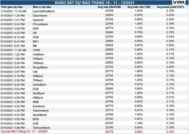 Hội Nghiên cứu Thị trường liên ngân hàng Việt Nam (VIRA) vừa cập nhật dự báo từ đại diện 27 thành viên đến từ các ngân hàng thương mại và công ty chứng khoán, về các chỉ tiêu chính trên thị trường tiền tệ trong tháng 10 và đến hết năm 2021.