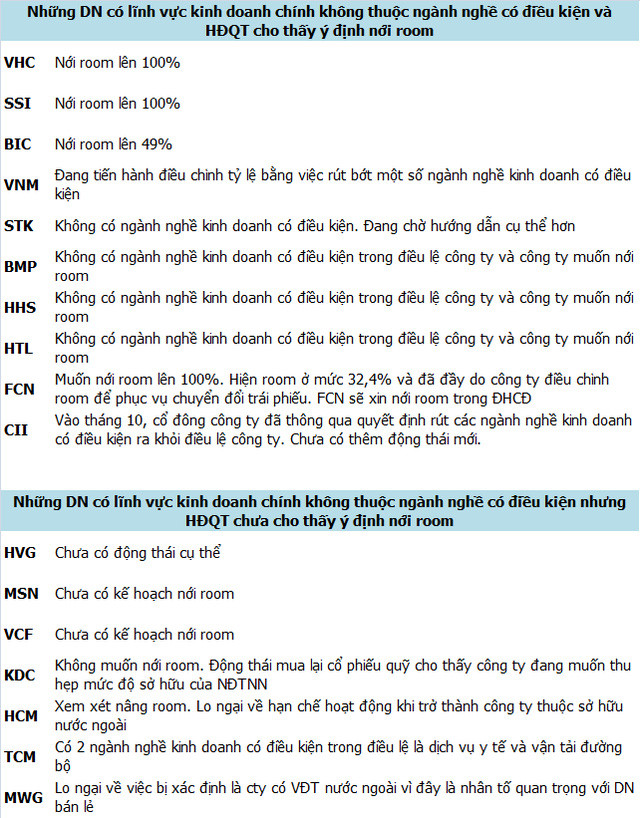 HHS, HTL, FCN... cũng thể hiện ý định nới room lên 100% và đang hoàn tất các thủ tục.