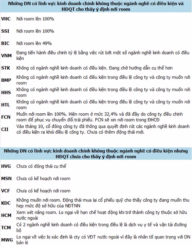 Còn lại, bên cạnh những công ty chỉ cần điều chỉnh điều lệ là có thể nới room thì có những đơn vị muốn chờ thêm diễn biến tình hình hay thông tin hướng dẫn rõ ràng hơn. CTCK HSC đã thống kê lại các trường hợp cụ thể để nhà đầu nắm rõ khi “đu” theo sóng nới room này.