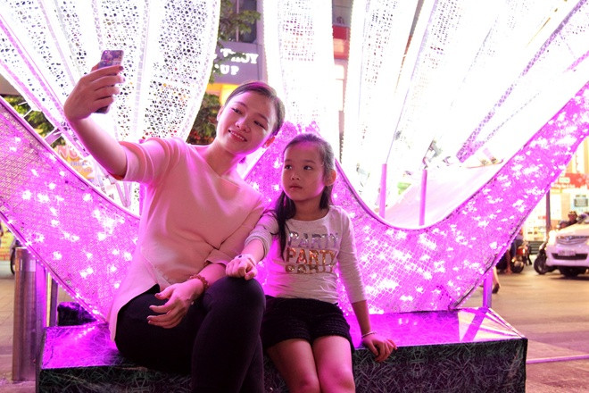 Nhiều bạn trẻ, gia đình đến phố đi bộ để chụp ảnh, vui chơi. Chị Huyền Anh (quận Bình Thạnh) đưa con gái đến đây xem phố xá được trang hoàng lộng lẫy mừng năm mới.