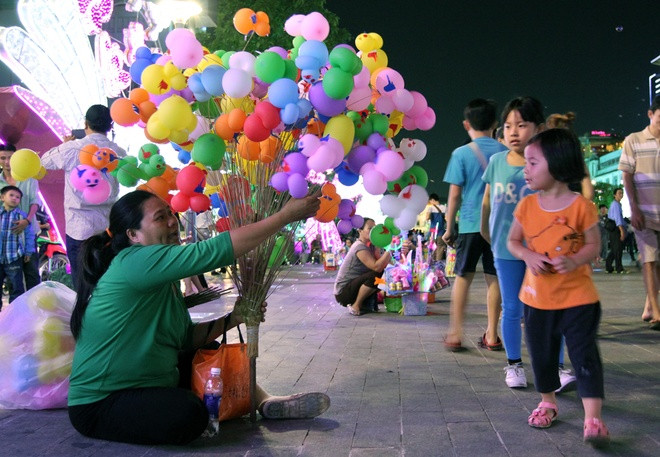 Năm nay, hầu hết người dân thành phố đều tập trung về phố đi bộ để tham quan, những khu vực khác rất ít người. Hai chị em bé Như Thảo được gia đình chở từ quận 9 lên chơi tỏ ra thích thú với màu sắc ở phố đi bộ.