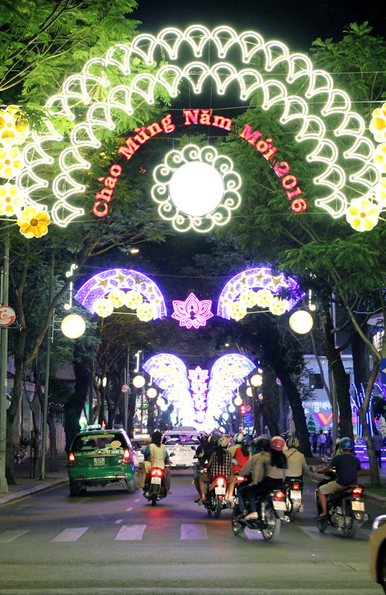 Về đêm những ngày cuối năm, trong khí trời se lạnh, sắc màu đón chào năm mới tràn ngập khắp các tuyến đường trung tâm TP HCM. Tại đường Nguyễn Huệ, UBND TP HCM cho thiết kế cổng hình vòm "Mừng xuât Bính Thân 2016" khiến nhiều người thích thú.