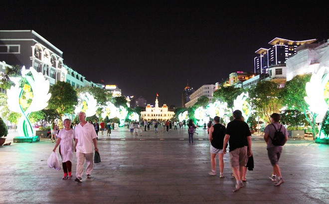 Phố đi bộ Nguyễn Huệ, con đường đẹp nhất của Sài Gòn, được trang trí rực rỡ với nhiều thiết kế từ tòa nhà UBND thành phố đến bờ sông Sài Gòn. Đêm xuống, nơi này thu hút rất nhiều người đến vui chơi.
