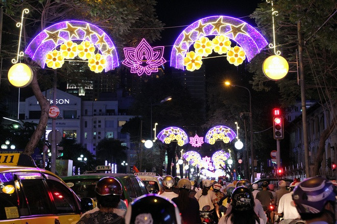 Các tuyến đường Phạm Ngọc Thạch, Lê Duẩn, Nam, Nam Kỳ Khởi Nghĩa... cũng được trang trí đèn, hoa chào năm mới. Những con đường rực rỡ ánh sáng nghệ thuật biến trung tâm TP HCM như một "kinh đô ánh sáng".
