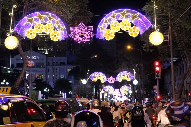 Đường phố Sài Gòn năm nay trang trí nhiều hơn, mỗi con đường đều có một phong cách riêng, tập trung vào các biểu tượng hoa. Trên đường Đồng Khởi, dàn đèn led đầy màu sắc được thiết kế bắt mắt.
