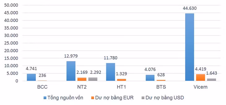 Hiện trên sàn chứng khoán một số doanh nghiệp niêm yết đang có những khoản vay bằng đồng EUR khá lớn. Có thể kể đến Công ty CP Xi măng Bỉm Sơn (BCC), Công ty CP Xi măng Hà Tiên 1 (HT1), Công ty CP Nhiệt điện dầu khí Nhơn Trạch 2 (NT2) và Công ty CP Xi măng Vicem Bút Sơn (BTS). Ngoài ra, “ông lớn” Tổng công ty Công nghiệp Xi măng Việt Nam (VICEM) cũng đang vay nợ rất nhiều bằng EUR.