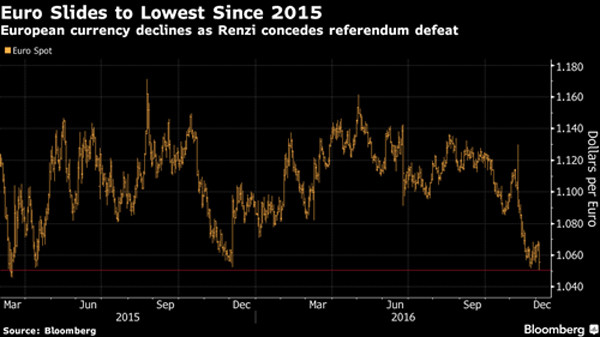 Euro sau đó tiếp tục trượt giá khi ông Renzi tuyên bố ý định từ chức. Có lúc, đồng tiền này chạm mức thấp nhất từ tháng 3/2015, với 1,0507 USD một euro. Đồng tiền chung châu Âu sau đó phục hồi phần nào, lên 1,0563 USD, dù vẫn thấp hơn giá cuối tuần trước 1%.