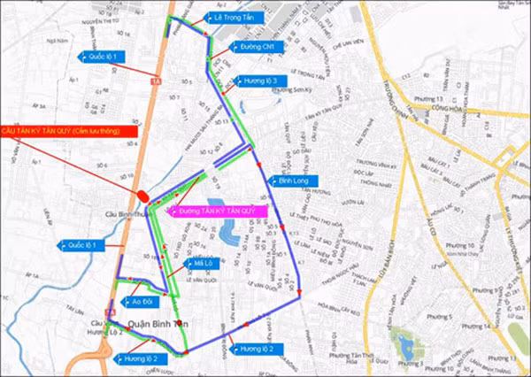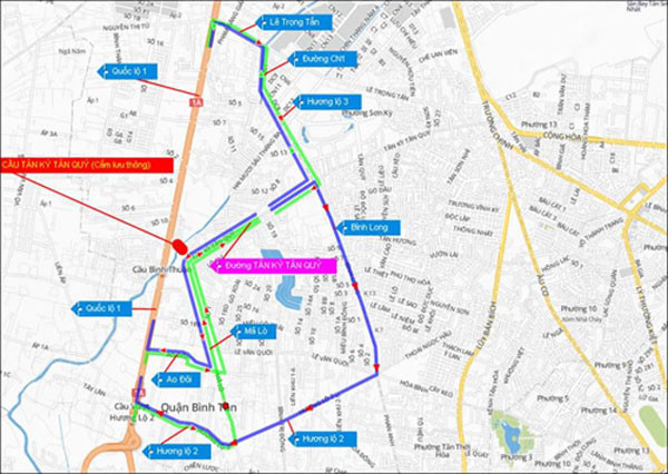 - Lộ trình 3 (dành cho xe 02 bánh): Tân Kỳ Tân Quý - Bình Long - Hương Lộ 2 - Quốc lộ 1.