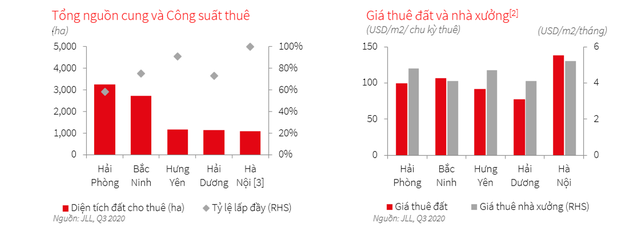 Số liệu của JLL cho thấy, giá đất khu công nghiệp miền Bắc đạt đỉnh mới với 102 USD/m2/chu kỳ thuê trong quý 3/2020, tăng 7,1% so với cùng kỳ năm ngoái.