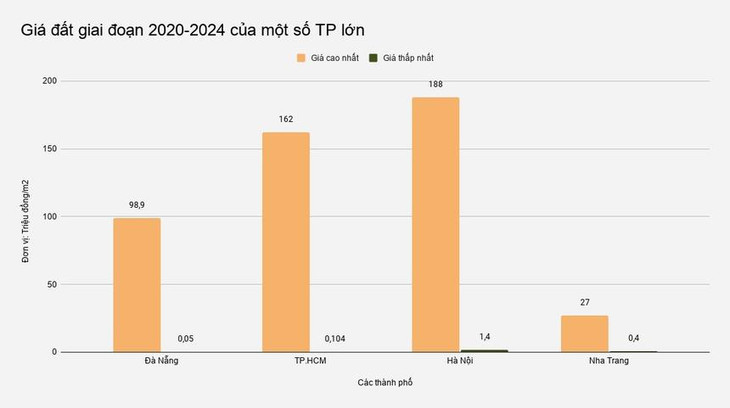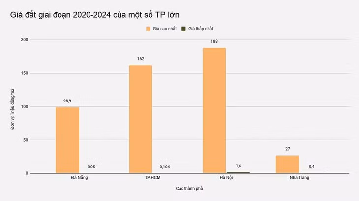 So sánh với các địa phương khác, giá đất cao nhất tại Đà Nẵng đang cao gấp 3,6 lần mức cao nhất 27 triệu đồng/m2 tại tỉnh Khánh Hòa (khu vực Nha Trang), cao gấp rưỡi mức 65 triệu đồng/m2 tại Huế, gấp khoảng 2,5 lần mức 40 triệu đồng/m2 tại Đồng Nai... Giá đất Đà Nẵng chỉ thấp hơn Hà Nội (cao nhất 188 triệu/m2) và TP.HCM (cao nhất 162 triệu/m2).