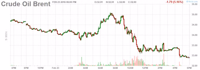 Giá dầu Brent giao tháng Tư giảm 1,44USD, tương đương 4,18%, xuống 33,24USD/thùng trên sàn ICE Futures Europe.