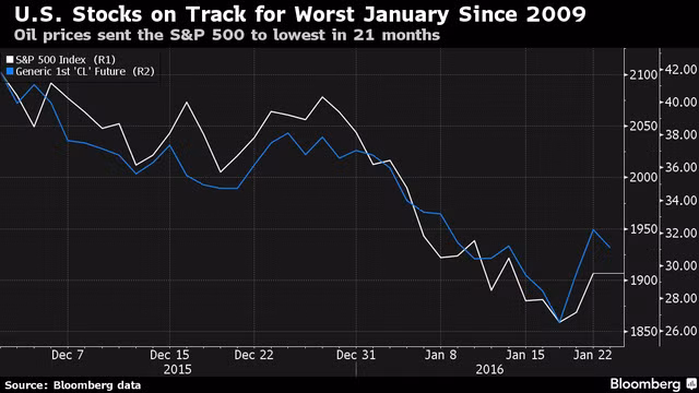 Kết thúc phiên hôm qua (25/1), chỉ số S&P 500 giảm 1,6%, xuống còn 1.877,07 điểm. Nhóm cổ phiếu năng lượng và khai khoáng giảm điểm mạnh nhất vì giá dầu thô lại xuống dưới ngưỡng 31 USD/thùng.