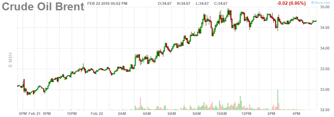 Giá dầu Brent giao tháng Tư tăng 1,68USD, tương đương 5,1%, lên 34,69USD/thùng trên sàn ICE Futures Europe.