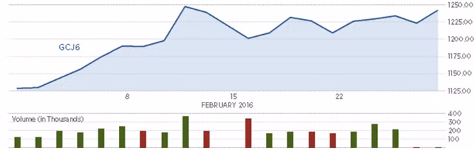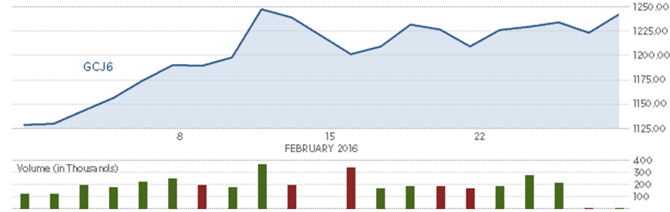 Tính từ đầu tháng Hai, giá vàng tăng gần 10,5%, đánh dấu tháng tăng mạnh nhất kể từ tháng 1/2012.