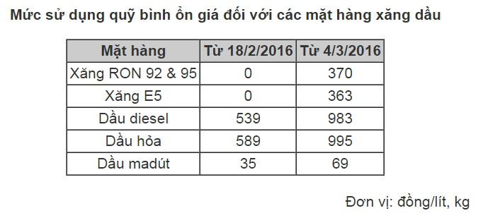 Hồi đầu năm nay, Bộ Tài chính cho biết quỹ bình ổn đến hết năm 2015 còn dư gần 4.000 tỷ đồng. Dù trong lần điều chỉnh ngày 4/3, liên bộ đã cho xả quỹ với xăng và trước đó nữa là với dầu từ 18/2, song với việc đồng thời đều đặn trích 300 đồng mỗi lít/kg từ đầu năm, ước tính số dư của quỹ đến giữa tháng này vẫn không giảm, ước còn khoảng 4.300 tỷ đồng.