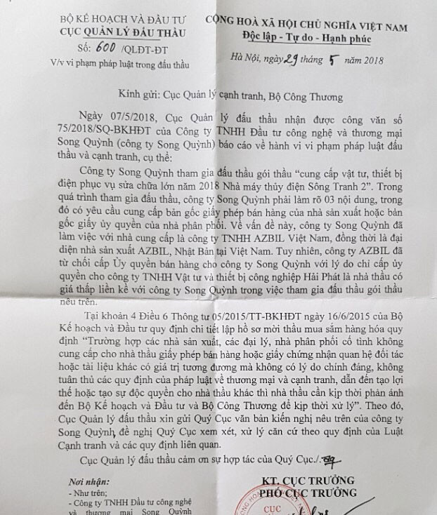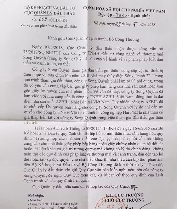 Cụ thể, Công ty Song Quỳnh tham gia đấu thầu cung cấp vật tư, thiết bị điện phục vụ sửa chữa lớn năm 2018 Nhà máy Thủy điện Sông Tranh 2. Trong quá trình tham gia đấu thầu, Công ty Song Quỳnh phải làm rõ 3 nội dung, trong đó có yêu cầu cung cấp bản gốc giấy phép bán hàng của nhà sản xuất hoặc bản gốc giấy ủy quyền của nhà phân phối. Về vấn đề này, Công ty Song Quỳnh đã làm việc với nhà cung cấp là Công ty TNHH Azbil Việt Nam, đồng thời là đại diện nhà sản xuất Azbil Nhật Bản tại Việt Nam. Tuy nhiên, Công ty Azbil đã từ chối cấp ủy quyền bán hàng cho Công ty Song Quỳnh với lý do chỉ cấp giấy ủy quyền cho Công ty TNHH Vật tư và Thiết bị công nghiệp Hải Phát - nhà thầu cùng tham gia đấu thầu gói thầu nêu trên và có giá thấp liền kề với Công ty Song Quỳnh.