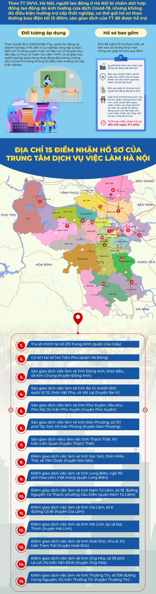 Người lao động bị chấm dứt hợp đồng lao động, nhưng không đủ điều kiện hưởng trợ cấp thất nghiệp có thể gửi hồ sơ đề nghị hỗ trợ theo đường bưu điện tới 15 điểm giao dịch của Trung tâm DVVL Hà Nội.