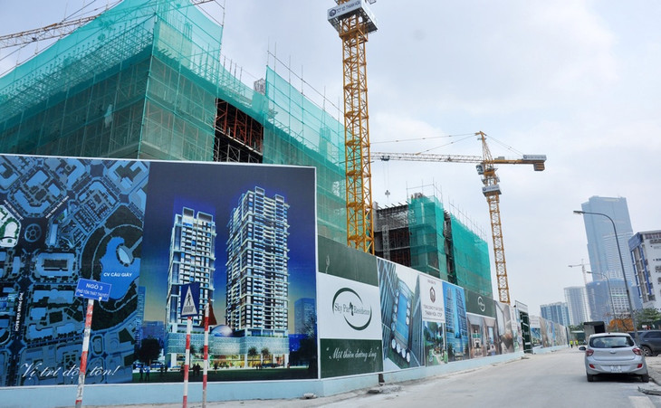 | Nhiều công trình xây dựng lấn chiếm vỉa hè tồn tại ở quận Cầu Giấy. Trong ảnh là dự án Khu phức hợp Căn hộ Văn Phòng Sky Park Residence (số 2 Tôn Thất Thuyết) doTổng công ty xây dựng Thanh Hóa làm chủ đầu tư. |