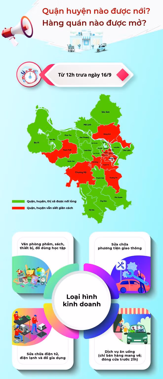 Từ 12h hôm nay, 16/9, Hà Nội cho phép mở lại một số hoạt động kinh doanh dịch vụ tại 19 quận, huyện, thị xã.