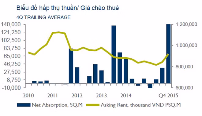Giá thuê trung bình tăng 6,9% theo quý và 2,7% theo năm do giá thuê cao ở 2 dự án mới, đạt 921 nghìn đồng/m2/tháng (40,8 USD/m2/tháng). Giá thuê trung bình khu vực trung tâm vẫn ổn định theo quý, ở mức 2,3 triệu đồng/m2/tháng (101 USD/ m2/tháng). Trong khi đó, giá thuê khu vực ngoài trung tâm tăng 9% theo quý, lên đến 873 nghìn đồng/m2/tháng (38,7USD/m2/tháng).