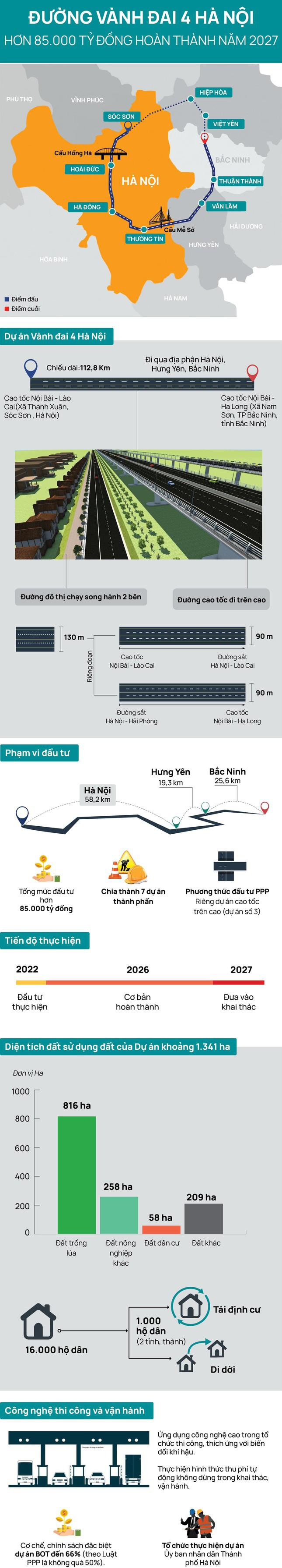 Để xây dựng tuyến đường Vành đai 4 với thiết kế, mặt bằng được giải phóng như trên, đại diện đơn vị Tư vấn dự án cho biết, đường Vành đai 4- Vùng thủ đô có 1.341 ha đất nằm trong diện phải GPMB. Trong đó riêng trên địa phận thành phố Hà Nội là 741 ha. Phân tích các loại đất phải GPMB, đơn vị Tư vấn cho biết, đất trồng lúa chiếm diện tích lớn nhất với khoảng 816 ha, tiếp đến là đất nông nghiệp khác khoảng 258 ha. Ít nhất là đất dân cư khoảng 58 ha. Số hộ dân phải thực hiện phương án di dời, tái định cư tại 2 tỉnh Hưng Yên, Bắc Ninh và thành phố Hà Nội khi thực hiện dự án Vành đai 4- Vùng thủ đô vào khoảng trên 1.000 hộ.