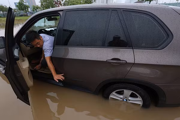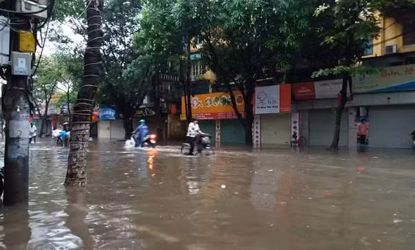 Người dân trên đường Trần Duy Hưng phải tát nước. Ảnh: Bá Đô.