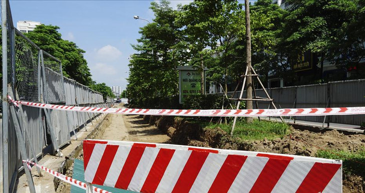 | Trong thời gian thi công, Sở GTVT Hà Nội tổ chức rào chắn bằng hàng rào tôn với chiều cao 2m xuyên dọc tuyến đường được mở rộng. |
