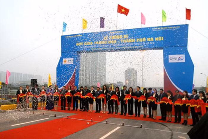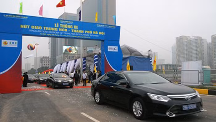 Tổng vốn đầu tư cho 2 dự án hơn 1.638 tỷ đồng, lấy từ nguồn vốn dư của dự án xây dựng đường vành đai 3 trên cao, do Nhật Bản cho vay. Hai dự án do Tổng Cty Xây dựng công trình giao thông 4 - CTCP (Cienco 4) và Cty TNHH Kỹ thuật và Xây dựng Hanshin thi công. Trong ảnh: Các đại biểu cắt băng thông xe hầm nút giao Đại lộ Thăng Long - Vành đai 3 Hà Nội.