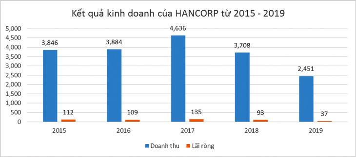Doanh thu của HANCORP từ mức 4.636 tỷ đồng năm 2017 đã giảm xuống còn 3.708 tỷ đồng năm 2018 và chỉ còn 2.451 tỷ đồng trong năm 2019. Lợi nhuận ròng theo đó cũng liên tục giảm sút, chỉ còn 37,3 tỷ đồng năm 2019 - mức thấp nhất trong vòng 5 năm trở lại đây (2015 - 2019).